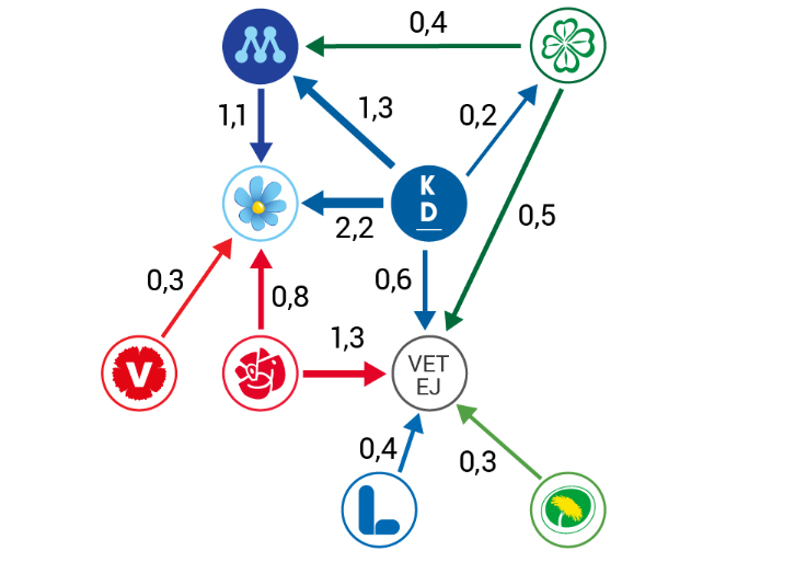 Moderaterna ökar med 2,3 procent till 18,3 procent. Kristdemokraterna rasar med 6,4 procentenheter till 6,6 procent, men hamnar ändå i nivå med riksdagsvalet. KD-väljarna har framförallt flyttat till Moderaterna och Sverigedemokraterna.