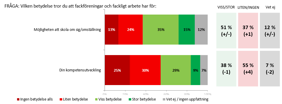 Novus-undersökningen visar också att 51 procent av de yrkesverksamma anser att fackföreningar har betydelse när det gäller omskolning och 38 procent när det gäller kompetensutveckling.