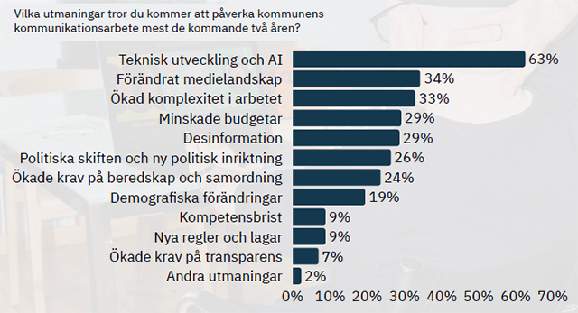 På frågan om vilka som är de största kommunikativa utmaningarna svarade 60 procent att nåt ut följt av förtroende & tillit (42 procent) och kommunicera komplexa frågor (40). På plats fyra hamnade internkommunikation (33).