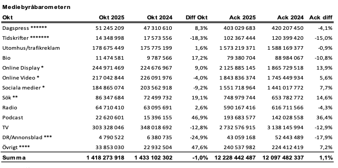 ”Dock något oväntat att online video och sociala medier, två kategorier som annars har vuxit snabbt under 2025, backade under månaden. Något annat som sticker ut är kategorin sök som fortsätter att öka, både under oktober och sett till året som helhet, där tillväxten nu uppgår till totalt 14,6 procent”, kommenterar hon.
