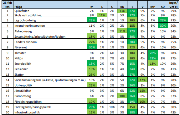 Socialdemokraterna anses ha bäst politik i 14 av de 20 viktigaste frågorna och nästbäst (ljusgrönt) i sex. Miljöpartiet anses ha bäst politik två frågor, klimat och miljö.