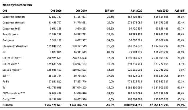 Under oktober minskade mediebyråernas köp med 13,3 till 1,2 miljarder kronor, jämfört med samma period 2019. En del av minskningarna kan bero på pandemin, andra på strukturella förändringar.