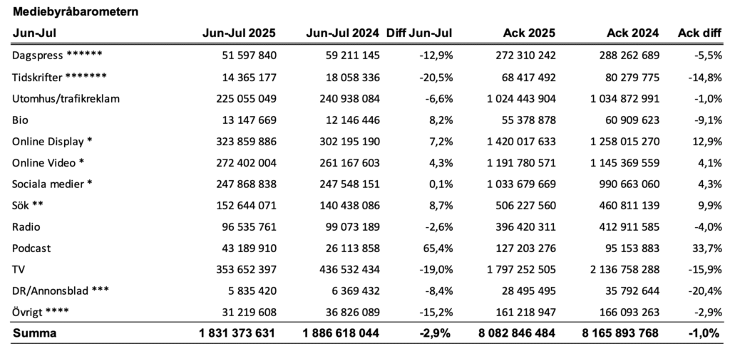 Under juni-juli minskade mediebyråernas reklamköp med 2,9 procent till 1,83 miljarder kronor. Podcast ökade mest med 65 procent, från en låg nivå, till 43,2 miljoner kronor. Tv är fortsatt mediebyråernas favoritkanal, trots ett tapp på 19 procent till 354 miljoner kronor. Online display rycker närmare toppen efter en ökning på 7,2 procent till 324 miljoner kronor.