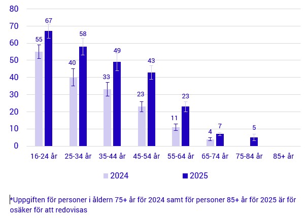 I åldersgruppen 16-24 ökade användandet från 55 till 67 procent, vilket är den största andelen. Användandet ökade mest i gruppen 45-54 där ökningen låg på 20 procentenheter till 43 procent.