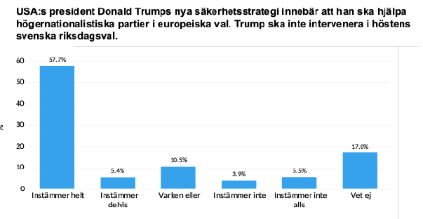 Skiftet frågade även om respondenterna instämmer i att ”Trump inte ska intervenera i höstens riksdagsval, med bakgrunden att USA nya säkerhetsdoktrin säger att landet ska hjälpa ”högernationalistiska partier i europeiska val”.