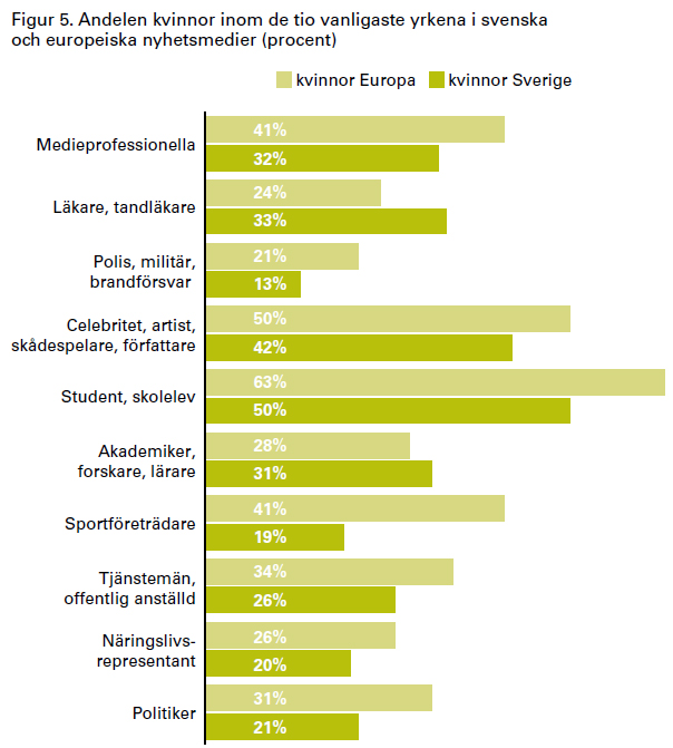 När det gäller olika roller är 21 procent experterna och 37 procent av talespersonerna i nyheterna kvinnor.