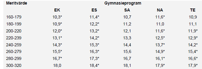 ” En elev som går ut med ett genomsnitt C i alla ämnen från högstadiet kan alltså förvänta sig 0,7 poäng högre avgångsbetyg från gymnasiet om hen väljer samhällsprogrammet i stället för det naturvetenskapliga programmet. För en elev som går ut med i genomsnitt B i alla ämnen är skillnaden 0,6 poäng. Skillnaden mot det estetiska programmet är hela 1,6 för gruppen med C i genomsnitt, och 1,2 för gruppen med B i genomsnitt”.