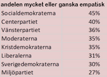 Snittet för andelen som upplever ett parti empatiskt ligger på 35 procent. Här ligger Socialdemokraterna i topp med 45 procent, följt av Centerpartiet och Vänsterpartiet. I botten ligger Miljöpartiet med 27 procent och SD med 30 procent.