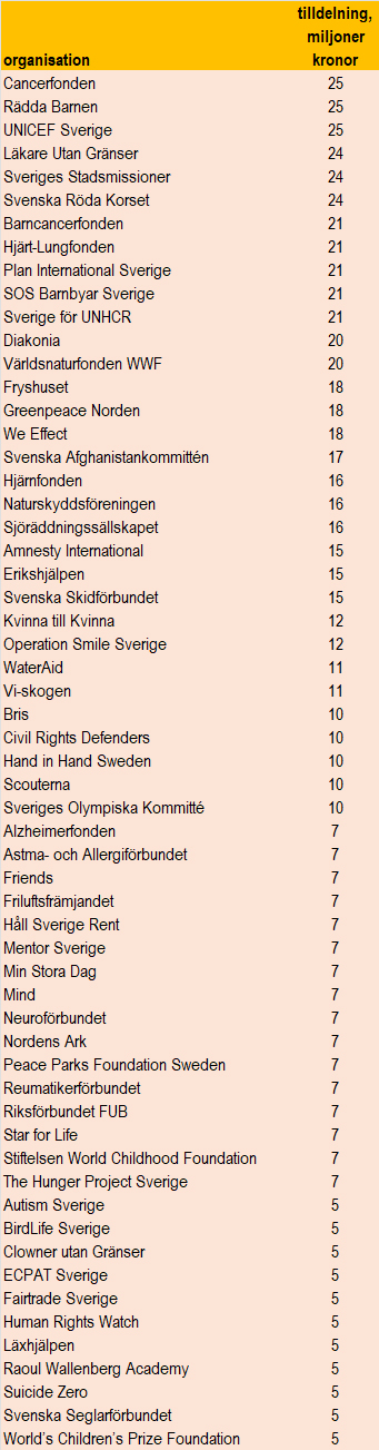 UPPDATERAD. Postkodlotteriet har fattat beslut om hur överskottet à 1,018 miljarder kronor ska fördelas till olika organisationer. En organisation är ny och två organisationer som har hamnat i blåsväder det senaste året är med bland förmånstagarna. Därefter får Cancerfonden, Rädda Barnen och Unicef Sverige 25 miljoner kronor vardera.