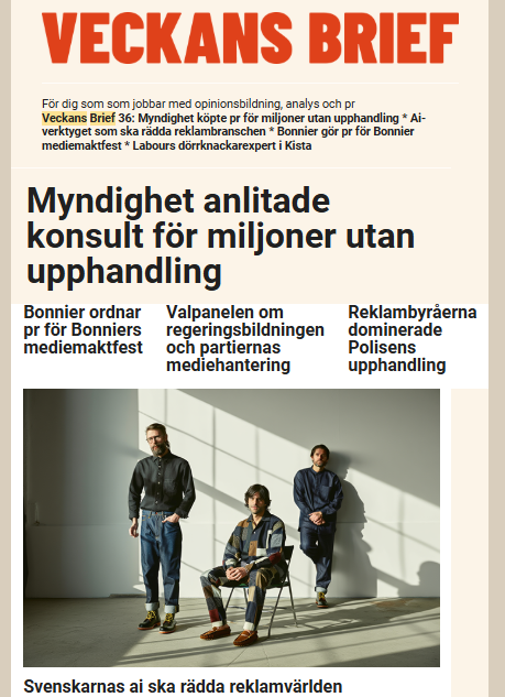 Här är innehållet i Dagens Opinions prenumererade veckomagasin Veckans Brief. Vi berättar om myndigheten som köpte pr för miljoner kronor av en känd konsult utan upphandling. Bröderna Ronge lanserar ett ai-verktyg som ska rädda den globala reklambranschen. Bonnier håller det i familjen när det ska göras pr och när den stora mediemaktfesten Stora Journalistpriset ska arrangerar. Labours förra dörrknackarexpert berättar om hur det var att knacka dörr i Kista. Nio tunga experter i Veckans Briefs valpanel ger sina tankar om regeringsbildningen och partierna mediehantering på sistone. Och mycket annat.