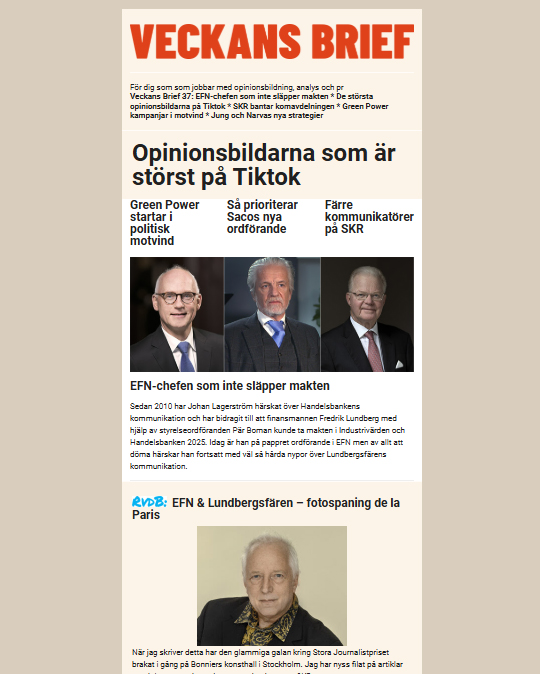 Här är innehållet i Dagens Opinions prenumererade veckomagasin Veckans Brief nummer 37. Vi berättar om hur EFNs ordförande är inblandad i Lundbergsfärens kommunikation, hur SKR ska stuva om kommunikationsavdelningen och om hur de största opinionsbildarna agerar på Tiktok. Plus 18 ytterligare artiklar.