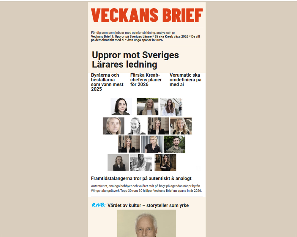 I säsongens första nummer av Dagens Opinions prenumererade veckomagasin Veckans Brief berättar vi om ett uppror bland förtroendevalda mot Sveriges Lärares ledning. Vi berättar om företaget som vill demokratisera public affairs med ai. 13 framtidstalanger berättar om sina jobbdrömmar och om vad som behövs för att lyckas med kommunikation idag. Vi presenterar också byråerna och uppdragsgivarna som vann mest i tävlingarna under 2025. Och ett 20-tal artiklar ytterligare.